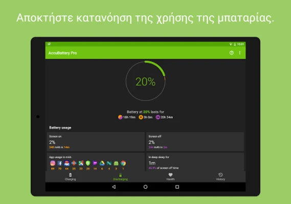 Το AccuBattery συγκεντρώνει όλα τα απαραίτητα δεδομένα: από την πραγματική χωρητικότητα της μπαταρίας σε mAh και την φθορά ανά κύκλο, έως τους υπολειπόμενους χρόνους φόρτισης και χρήσης, τόσο με ανοιχτή όσο και με κλειστή οθόνη. Παρακολουθήστε την κατανάλωση ανά εφαρμογή, τον ρυθμό αποφόρτισης και την αναλογία αδρανοποίησης με μια ματιά, χάρη στις συνεχείς ειδοποιήσεις. Για μια ακόμα πιο αναβαθμισμένη εμπειρία, η έκδοση Pro προσφέρει σκούρα θέματα, εκτενές ιστορικό και λεπτομερή στατιστικά χωρίς διαφημίσεις. Το AccuBattery δημιουργήθηκε από μια μικρή, ανεξάρτητη εταιρεία με πάθος για την ποιότητα και την ακρίβεια στα στατιστικά μπαταρίας, διασφαλίζοντας την ιδιωτικότητά σας χωρίς πρόσβαση σε προσωπικά δεδομένα και χωρίς ψευδείς υποσχέσεις. Εμπιστευτείτε το AccuBattery για μια υγιέστερη, μακροβιότερη μπαταρία.
