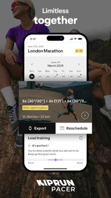 Ξεκινήστε το δρομικό σας ταξίδι με τον απόλυτο σύντροφο: την εφαρμογή Kiprun Pacer. Αφήστε πίσω τις γενικές προπονήσεις και ανακαλύψτε έναν προσωπικό προπονητή που δημιουργεί εξατομικευμένα προγράμματα, σχεδιασμένα για να κατακτήσετε τους στόχους σας με ακρίβεια και ασφάλεια. Απλά ορίστε τον επιθυμητό χρόνο αγώνα και το επίπεδό σας, και η Kiprun Pacer θα σας προσφέρει άμεσα ένα ολοκληρωμένο πλάνο. Κάθε προπόνηση είναι προσαρμοσμένη στην ένταση που χρειάζεστε, εξασφαλίζοντας όχι μόνο την επίτευξη των επιδόσεών σας, αλλά και την αποφυγή τραυματισμών, κάνοντας κάθε βήμα μία απολαυστική εμπειρία.