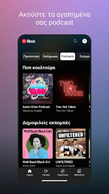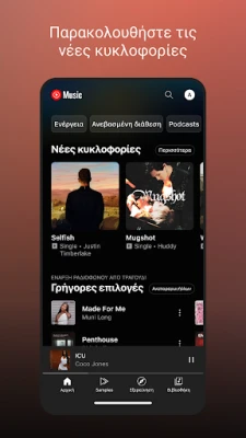 Το YouTube Music σας συνδέει με έναν κόσμο μουσικής. Ανακαλύψτε ζωντανές ερμηνείες, ρεμίξ και αποκλειστικά κομμάτια. Απολαύστε χιλιάδες επιλεγμένα playlist και εξατομικευμένες μίξεις για κάθε διάθεση και δραστηριότητα. Δημιουργήστε τα δικά σας playlist και εξερευνήστε μια πλούσια μουσική βιβλιοθήκη, πάντα ενημερωμένη με τις τάσεις και τις προτιμήσεις σας.