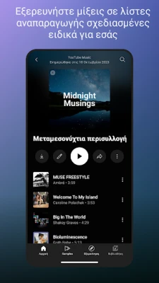 Ξεκλειδώστε έναν κόσμο μουσικής με το YouTube Music, την απόλυτη πλατφόρμα για τους λάτρεις της μουσικής. Ανακαλύψτε ένα εκτενές αρχείο που περιλαμβάνει ζωντανές ερμηνείες, ευφάνταστες διασκευές, πρωτότυπα remixes και αποκλειστικά κομμάτια που δεν θα συναντήσετε πουθενά αλλού. Βυθιστείτε σε χιλιάδες προσεκτικά επιμελημένες λίστες αναπαραγωγής, σχεδιασμένες να ταιριάζουν σε κάθε μουσικό γούστο, διάθεση και δραστηριότητα, εξασφαλίζοντας πως η ιδανική μελωδία είναι πάντα στη διάθεσή σας.